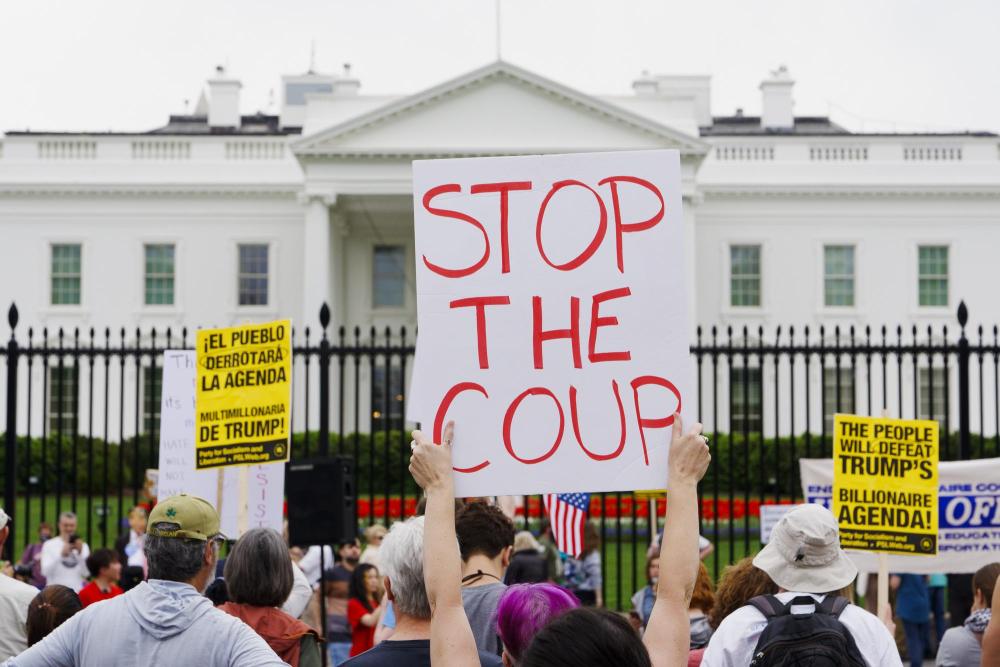4月19日,人們在美國首都華盛頓白宮門前參加抗議活動。美國多地19日舉行抗議活動,首都華盛頓、紐約、舊金山、波士頓等城市的民眾走上街頭,抗議現政府大規模裁員、加徵關税、驅逐移民等政策。新華社發(亞倫攝)