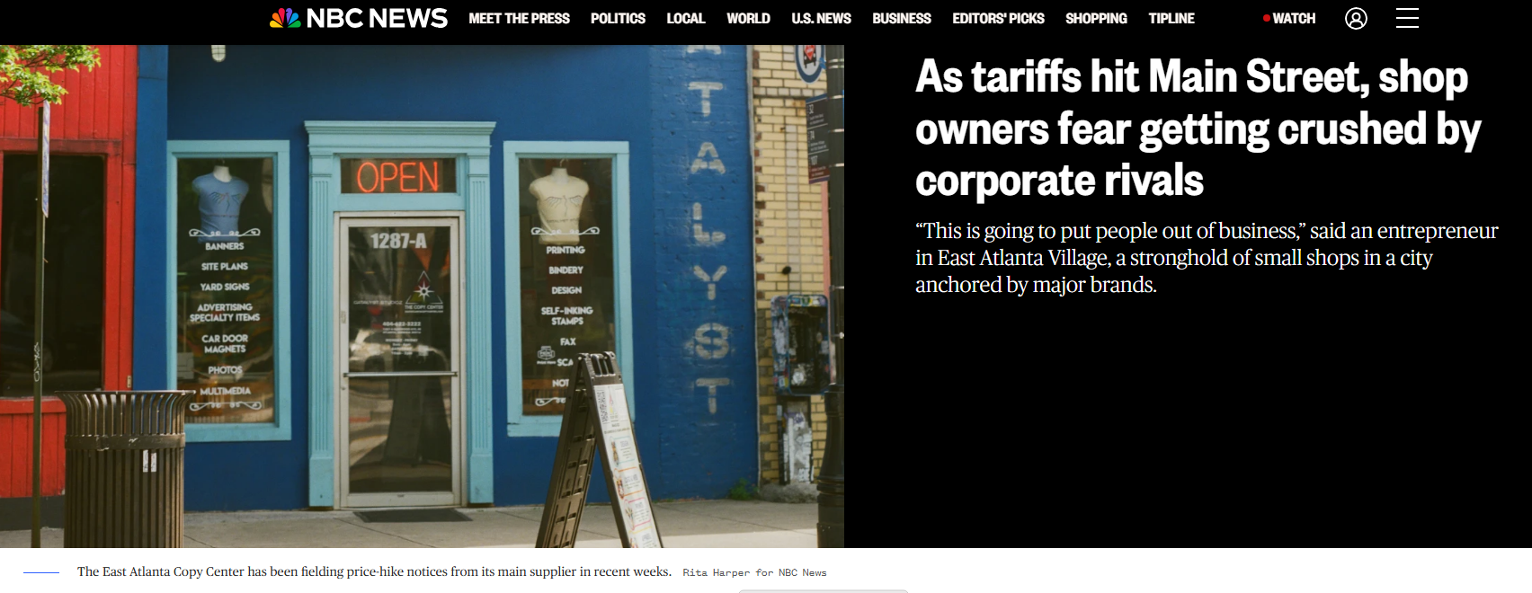 美國全國廣播公司網站的一篇報道説,隨着關税衝擊美國商業,美國小企業主都在擔心自己的企業被壓垮。