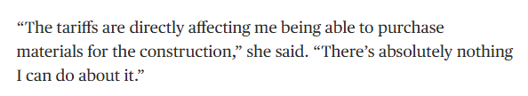 “關税直接影響了我購買建築材料的能力”,西爾維斯特羅斯説。“我對此完全無能為力。”