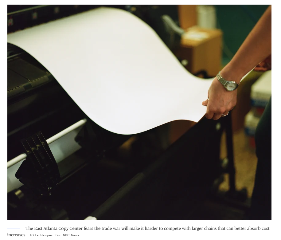 報道以一家在東亞特蘭大村的印刷店為例説,企業主米基·西爾維斯特羅斯表示,近期,她的主要供應商不斷通知她,從複印紙到螺旋裝訂線圈、覆膜卷等所有材料的價格都在上漲,這迫使她將經營重點從擴大業務轉移到重新調整採購上。