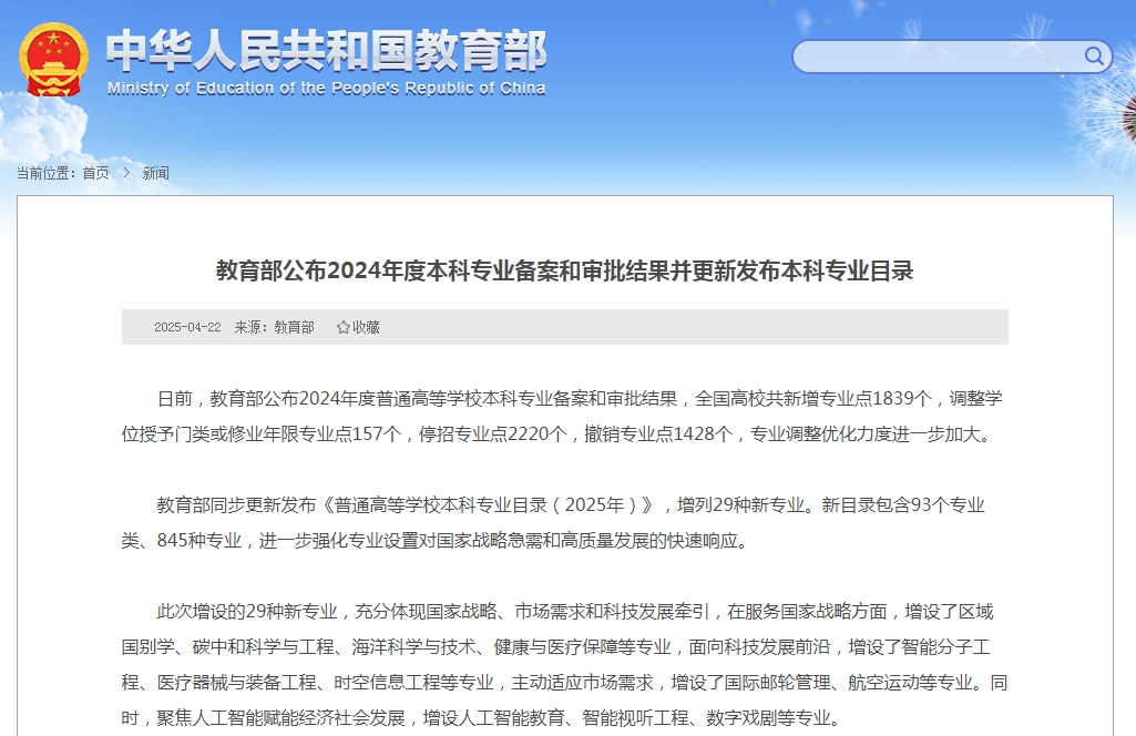 今天(22日),教育部發布2025年普通高校本科專業目錄,公佈最新本科專業備案和審批結果,共增設29種本科新專業,納入2025年高考招生,並首次建立戰略急需專業超常設置機制。