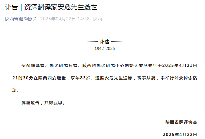 據陝西省翻譯協會發布的訃告,資深翻譯家、斯諾研究專家、陝西省斯諾研究中心創始人安危先生於2025年4月22日凌晨在陝西西安去世,享年83歲。