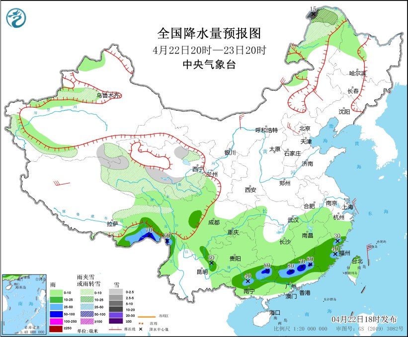 *4月22日20時至23日20時,*新疆沿天山西部及南疆西部山區、青海中南部、西藏東北部、川西高原北部、內蒙古東北部、黑龍江西北部等地部分地區有小雪或雨夾雪,其中,內蒙古東北部、黑龍江西北部等地部分地區有中到大雪、局地暴雪(10~15毫米)。湖南南部、江西南部、浙江南部、福建、廣東大部、廣西、川西高原東部、雲南東北部和西部等地部分地區有中到大雨,其中,江西南部、福建東部和北部、廣西中部和北部、廣東北部、雲南西北部、西藏東南部等地部分地區有暴雨(50~80毫米)。內蒙古中東部、河北北中部、西藏西部等地部分地區有4~6級風;渤海、東海南部海域、台灣以東洋麪將有4~6級、陣風7級的大風(見圖1)。