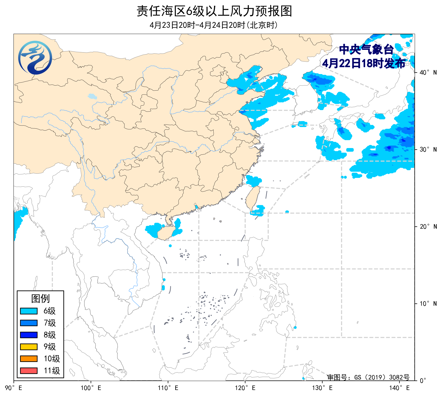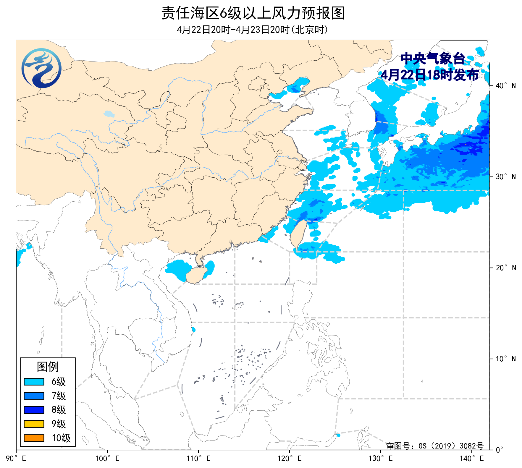 4月22日02時至14時,渤海、黃海南部海域出現了5~6級、陣風7級的東北風或偏北風,東海大部海域、台灣海峽、台灣以東洋麪出現了5~7級、陣風8級的偏南風或西南風。渤海、黃海南部海域、東海西北部海域出現了能見度不足1公里的大霧。