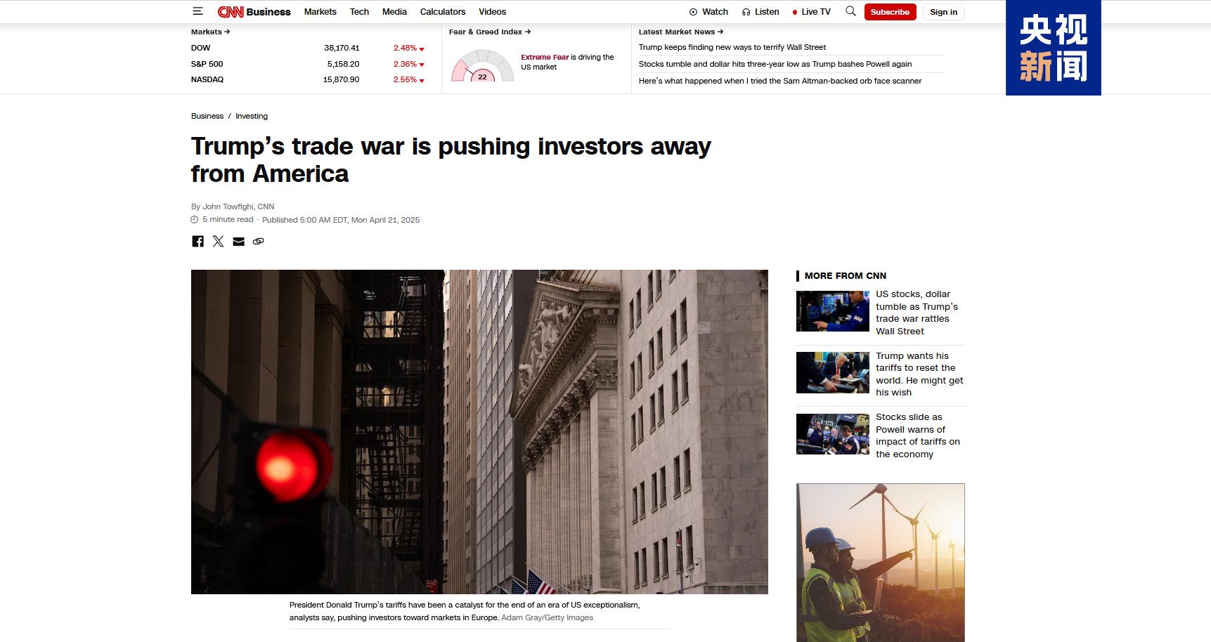 △美國有線電視新聞網近日以“特朗普的貿易戰正將投資者推離美國”為題刊文。