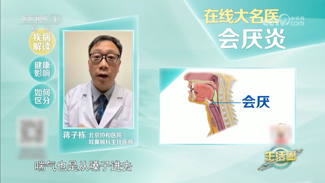 會厭位於人體氣管上方、舌根根部。人在説話或呼吸時,會厭向上使喉腔開放;吞嚥時,會厭則向下蓋住氣管,防止食物進入造成嗆咳。一旦會厭發炎,這層“蓋子”就會不斷腫脹,嚴重時會腫成球狀,導致氣道封閉,讓人透不上氣。