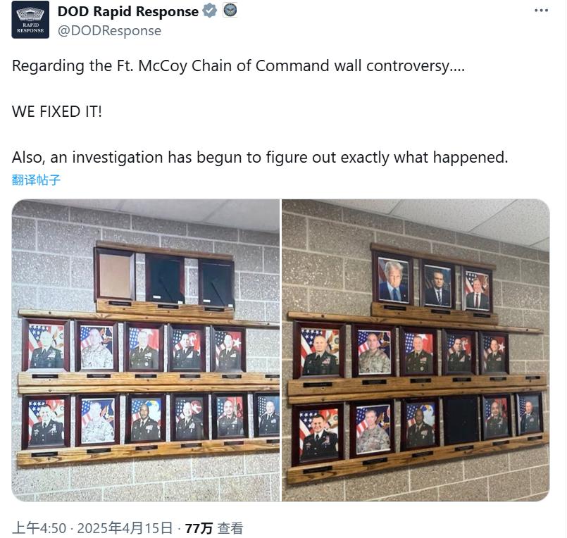 此前,五角大樓宣佈對這面牆出現空白相框的原因展開調查,並在X平台上發佈照片顯示肖像照已經掛好。相關帖文寫道:“關於麥考伊堡指揮鏈牆面的爭議……我們已經解決了!另外,調查已經啓動,以查明究竟發生了什麼。”