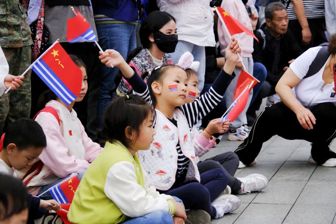 孩童用稚嫩的手揮舞着國旗、海軍旗
