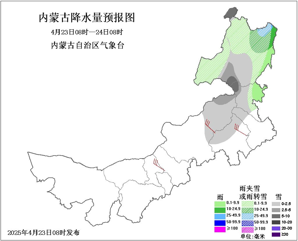 預計,今明兩天(4月23日-24日),受冷空氣影響,內蒙古氣温再起波瀾,全區大部氣温普降4~8℃,西部偏東北和中部偏北局地氣温下降10℃以上,公眾要及時調整着裝,謹防受涼感冒。中部偏東和東部大部地區有雨雪天氣出現,東北部部分地區有中到大雪,局地暴雪。同時,多地風力大增,有5、6級短時7、8級局地9級西北風,中西部局地或伴有沙塵天氣,公眾出行注意做好健康防護。25日夜-27日還有一場冷空氣在排隊等候。