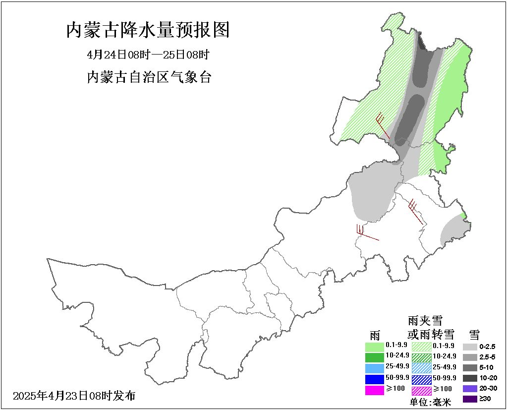 24日08時至25日08時,我區中部偏東北和東部大部地區多雲,錫林郭勒盟東北部、通遼市東南部、興安盟中部和北部、呼倫貝爾市大部有小雪、雨夾雪或小雨,興安盟西北部、呼倫貝爾市中部有中到大雪,局地暴雪,其餘地區晴間多雲;中部偏東和東部地區5、6級短時7、8級局地9級西北風。
