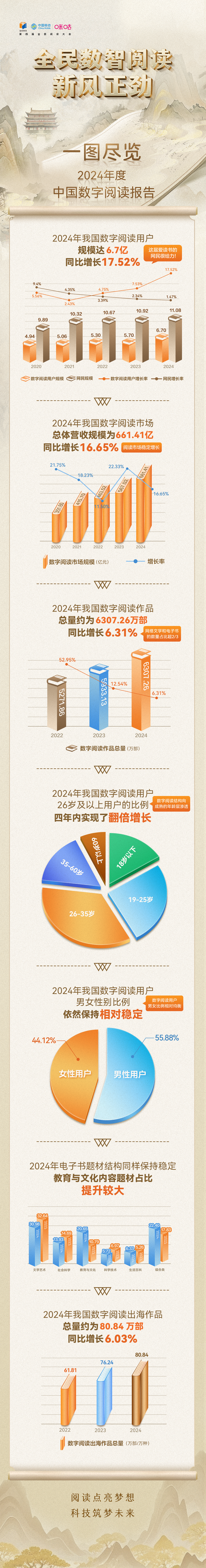 報告顯示,2024年我國數字閲讀市場總營收661.41億元,同比增長16.65%;用户規模6.70億,同比增長17.52%,26歲及以上用户佔比四年內翻倍,用户結構向成熟年齡層深度滲透,作品總量同比增長6.31%,行業加速向視聽化融合生態演進。
