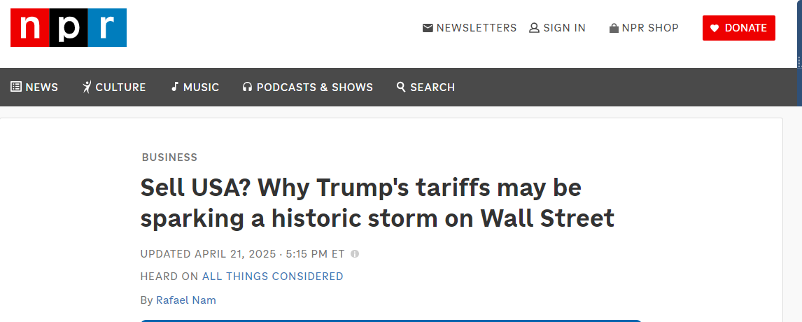 中國日報網4月22日電 據美國國家公共廣播電台(NPR)網站4月21日報道,美國金融體系過去被視為全球最穩定和強大的體系之一。然而,由於美國現任政府4月2日推出的所謂全球“對等關税”政策,美國金融市場出現了前所未有的危機:全球投資者可能因美國政策的不確定性而對美國失去信心。