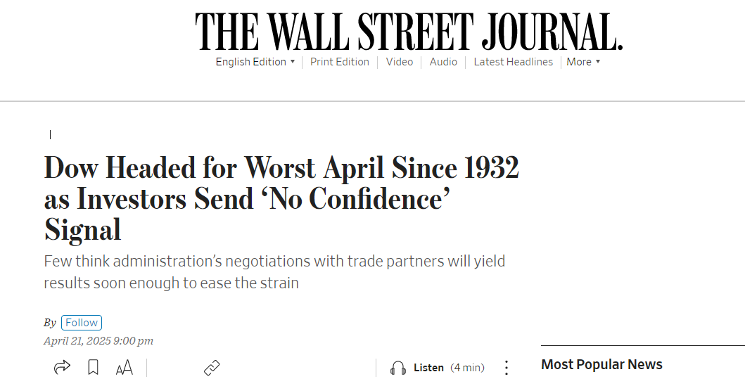 另據《華爾街日報》4月21日報道,道指或將創下近百年來最差4月表現,投資者發出“不信任”信號。