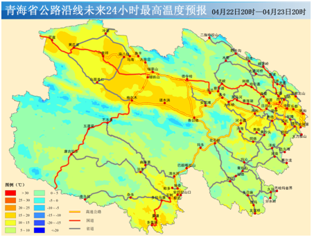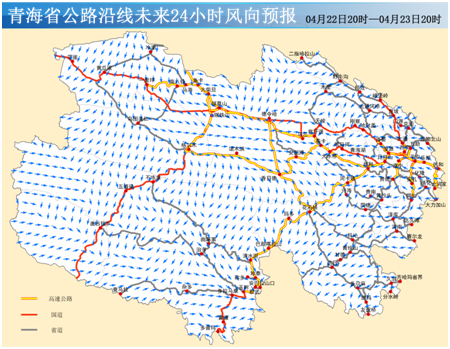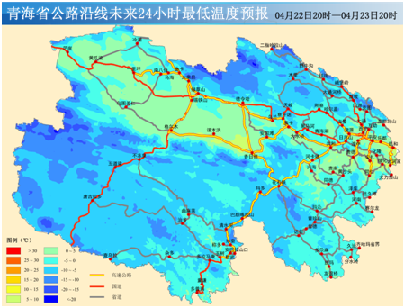 04月23日20時~04月24日20時:班瑪、久治的部分鄉鎮有大到暴雪(5.0~13.0毫米),剛察、門源、曲麻萊的部分鄉鎮有中雪(2.5~4.9毫米),西寧大部、海北大部、海南南部、玉樹、果洛、黃南大部及共和、天峻、格爾木市、都蘭的部分鄉鎮有小雨(雪)或雨夾雪(0.1~9.5毫米),省內其餘地區晴或多雲。