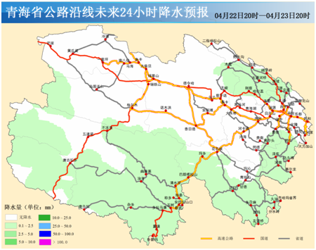 04月24日20時~04月25日20時:祁連、剛察、天峻、格爾木市、治多、曲麻萊、稱多、瑪多的部分鄉鎮有中到大雪(2.5~9.9毫米),海東大部、海西東部、海北、玉樹、果洛、黃南及大通、湟源、湟中、興海、共和、格爾木市的部分鄉鎮有小雨(雪)或雨夾雪(0.1~10.4毫米),省內其餘地區晴或多雲。