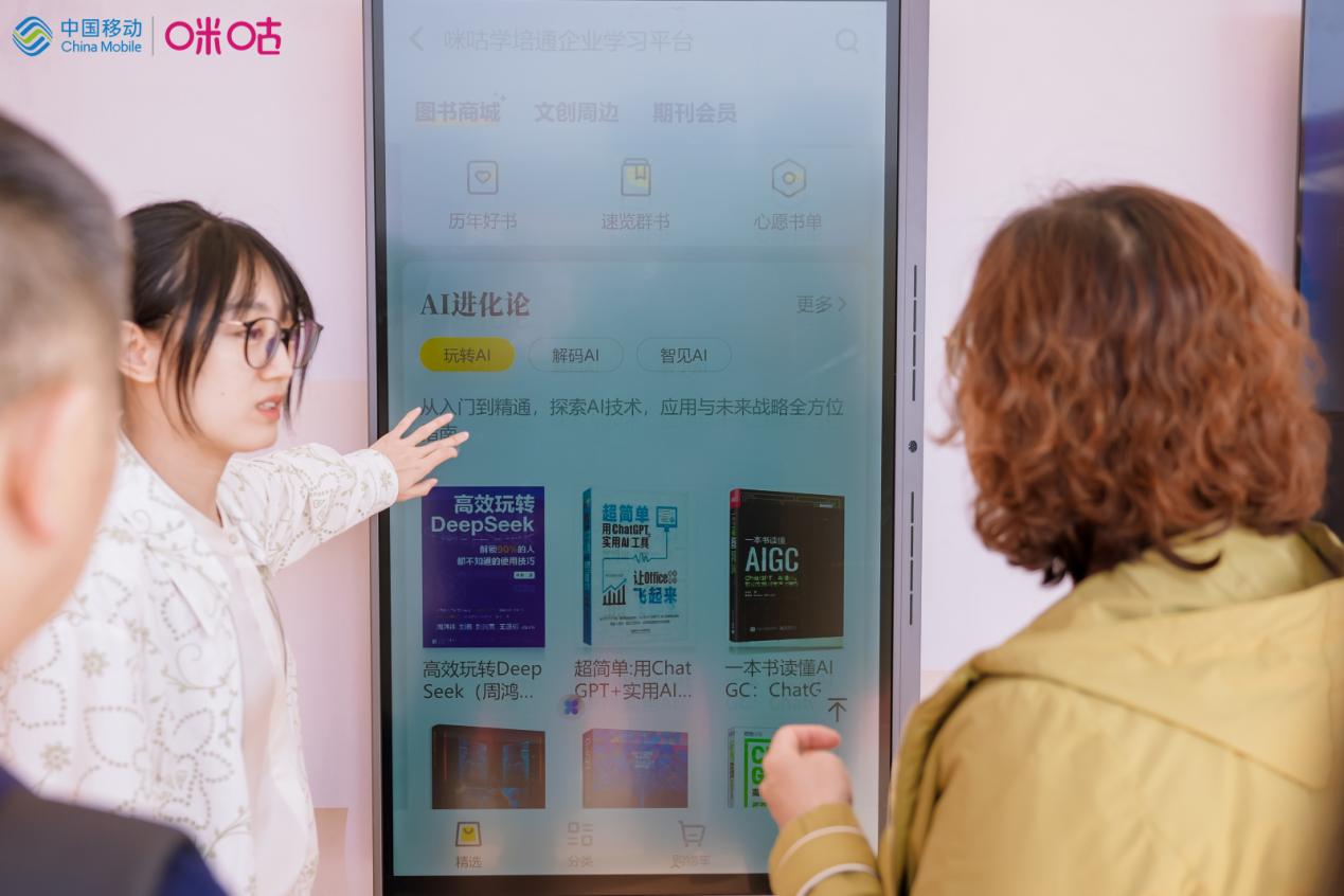 基於“讓文化潤澤千行百業”的願景,咪咕公司的展項還包括全民閲讀進企業展台。以書為核心,通過AI賦能傳統書課學習,融合線上線下特色服務,咪咕公司打造了咪咕學培通企業學習 平台,推進全民閲讀進企業,助力學習型社會建設,為企業提供一站式數智學習解決方案。現場觀眾可體驗咪咕學培通包括圖書、音視頻課程、知識期刊會員、文創周邊、AI+學習工具等板塊,瞭解個性化的學習需求。