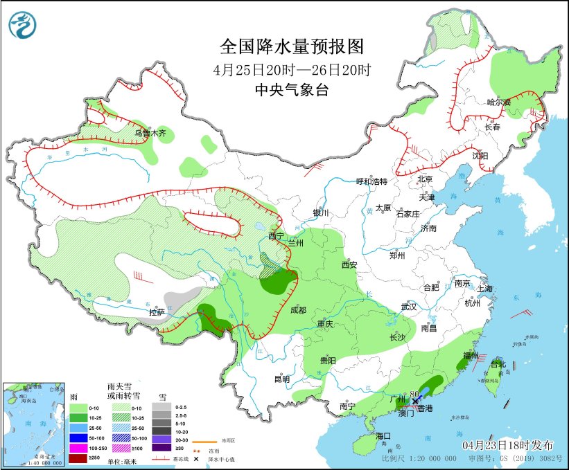 *4月25日20時至26日20時,*西藏大部、青海大部、內蒙古東北部、黑龍江西北部、新疆沿天山地區等地部分地區有小雪或雨夾雪。西藏東南部、川西高原、西北地區東南部、西南地區東部、江南西北部和東部、華南中東部等地部分地區有小到中雨,其中,廣東東南部沿海等地局地有大到暴雨(50~80毫米)。內蒙古中部和西北部、吉林東部、河北北部、西藏等地部分地區有4~6級風,其中,西藏北部部分地區有6~7級風(見圖5)。