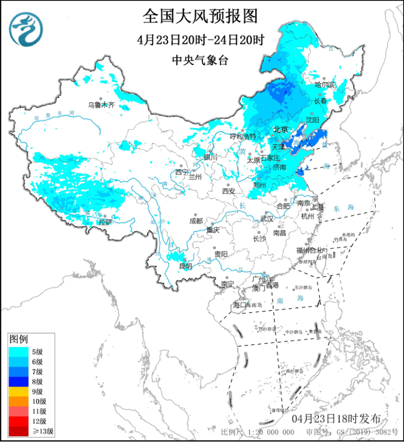 23日夜間至24日,內蒙古中東部、黑龍江西北部、吉林中西部、遼寧、河北北部和東部、北京西部山區、天津、山東、河南中東部、江蘇北部等地有5~6級、陣風7~9級的大風,其中,內蒙古東部部分地區平均風力可達7級、陣風10級;渤海、渤海海峽、黃海北部海域將有7級、陣風8~9級的大風(見圖2),中央氣象台4月23日18時發佈大風藍色預警。