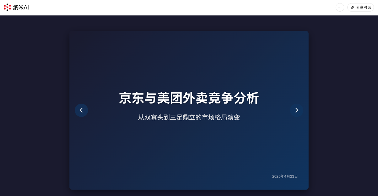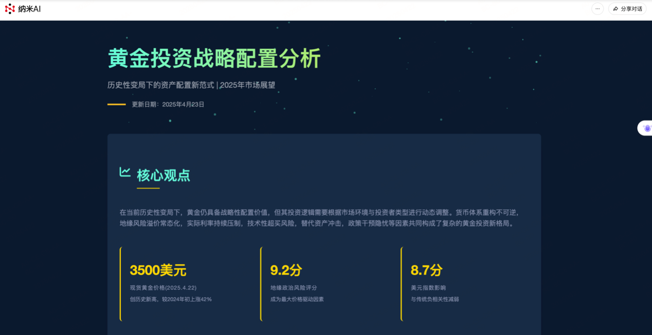 官方介紹,在納米AI客户端內找到萬能工具箱,選擇“納米AI超級搜索”等MCP工具,以“最近兩家有外賣業務的公司正在激烈競爭,分析他們的財報,告訴我該購買哪一家的股票”為指令開始測試,調用了上述工具的大模型會自動提取兩家公司的財務數據和業務發展信息,10餘分鐘便生成內容紮實、設計酷炫的結果。在納米AI站內,點擊創建智能體按鍵,在技能選擇框裏選擇“熱門新聞”工具,不到1分鐘即可配置一個智能體,使用這個智能體分析2025年上海車展看點,智能體能快速給出逛展路線圖、新能源車亮點對比、上海車展展館分佈與人流分析等多個維度的分析結果,其效率遠超人工。