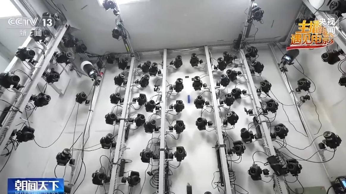 *張韜:*這個動作捕捉服的穿戴很有講究,根據骨骼關節的位置將67個反光點貼滿全身,再去到動捕區裏。 動捕區四周有大型的鋼架,鋼架上有動捕機器,捕捉動捕服上的反光點,最後生成一個數字人物形象。這套動作捕捉系統可以做到即時渲染,連手指等細節都不放過,精度達到亞毫米級。