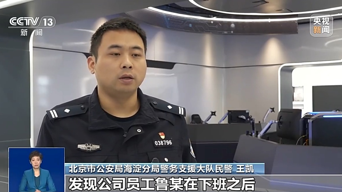*北京市公安局海淀分局警務支援大隊民警 王凱:*公司調取監控錄像,發現公司員工魯某在下班之後,並沒有離開工區,並在多個工位內逗留,疑似向公司的辦公電腦插入U盤等外接設備。他們公司有一個負責網絡安全的員工,電腦啓動之後,就發現進程裏邊跑了很多未知的進程,疑似是木馬進程。