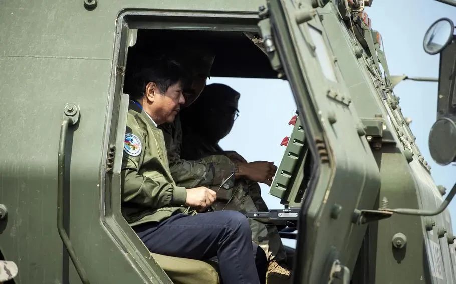 資料圖:2023年,菲律賓總統馬科斯在美菲“肩並肩”聯合軍演中登上“海馬斯”火箭炮系統發射車(來源:環球時報)
