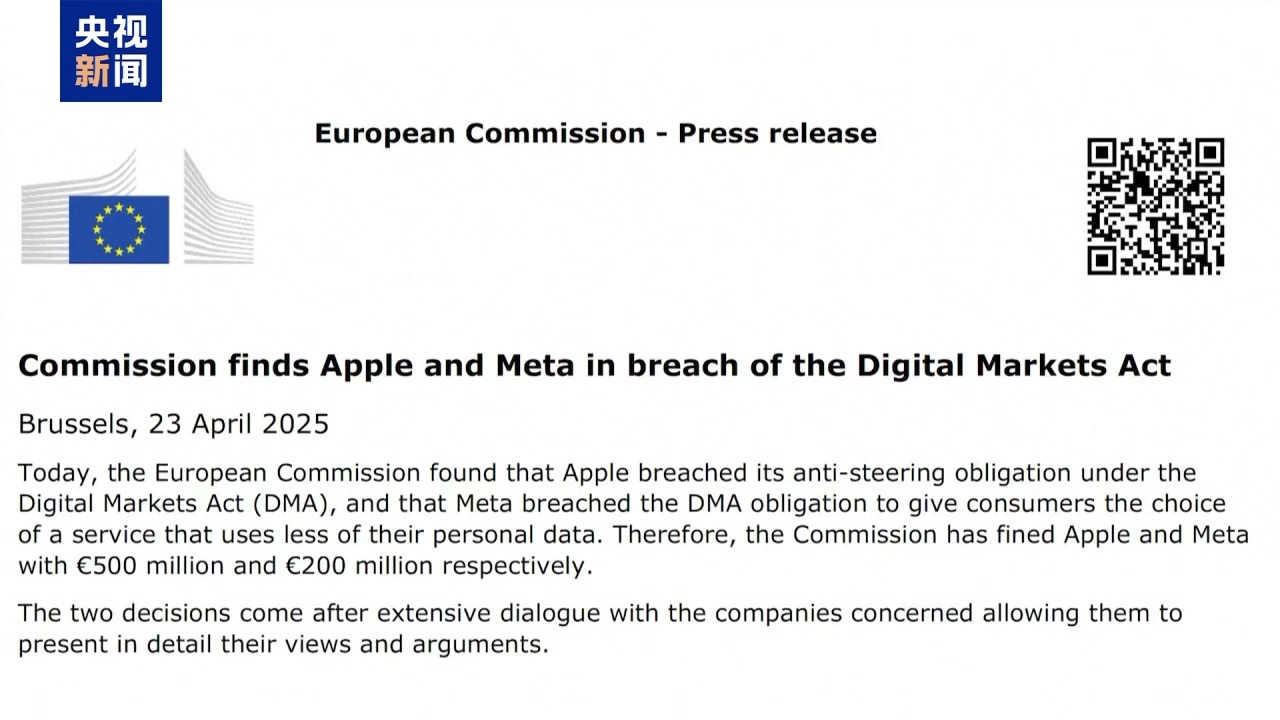 *總枱記者 顧鑫:*事實上此次處罰來自歐盟對科技巨頭展開長達一年的調查。歐盟競爭事務專員裏韋拉表示,這項罰款“傳遞出強烈且明確的信息”,歐盟將“堅定但平衡地”執行數字監管。除了罰款,蘋果公司還收到了一項停止令,要求在6月底前對產品進行進一步修改,否則將面臨每日追加罰款。歐盟也正在評估元公司去年底為合規所作的調整是否到位。值得注意的是,這兩項程序性罰款金額雖高,但仍低於此前歐盟因反壟斷行為對蘋果和元公司開出的兩筆鉅額罰款。