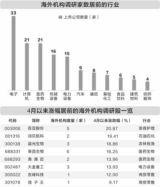 從行業分佈來看,電子、計算機、醫藥生物三大行業獲海外機構重點關注,分別有33家、21家和21家上市公司獲調研。電力設備、汽車、通信和基礎化工行業也有超5家以上公司獲海外機構調研。
