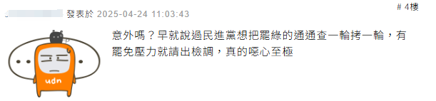 針對台檢方最新舉動,有網友在相關報道評論區留言,“看來已經沒完沒了了!”“人要被毀之前必定瘋狂”“意外嗎?早就説過民進黨想把罷綠的通通查一輪拷一輪,有罷免壓力就請出檢調,真的噁心至極”。