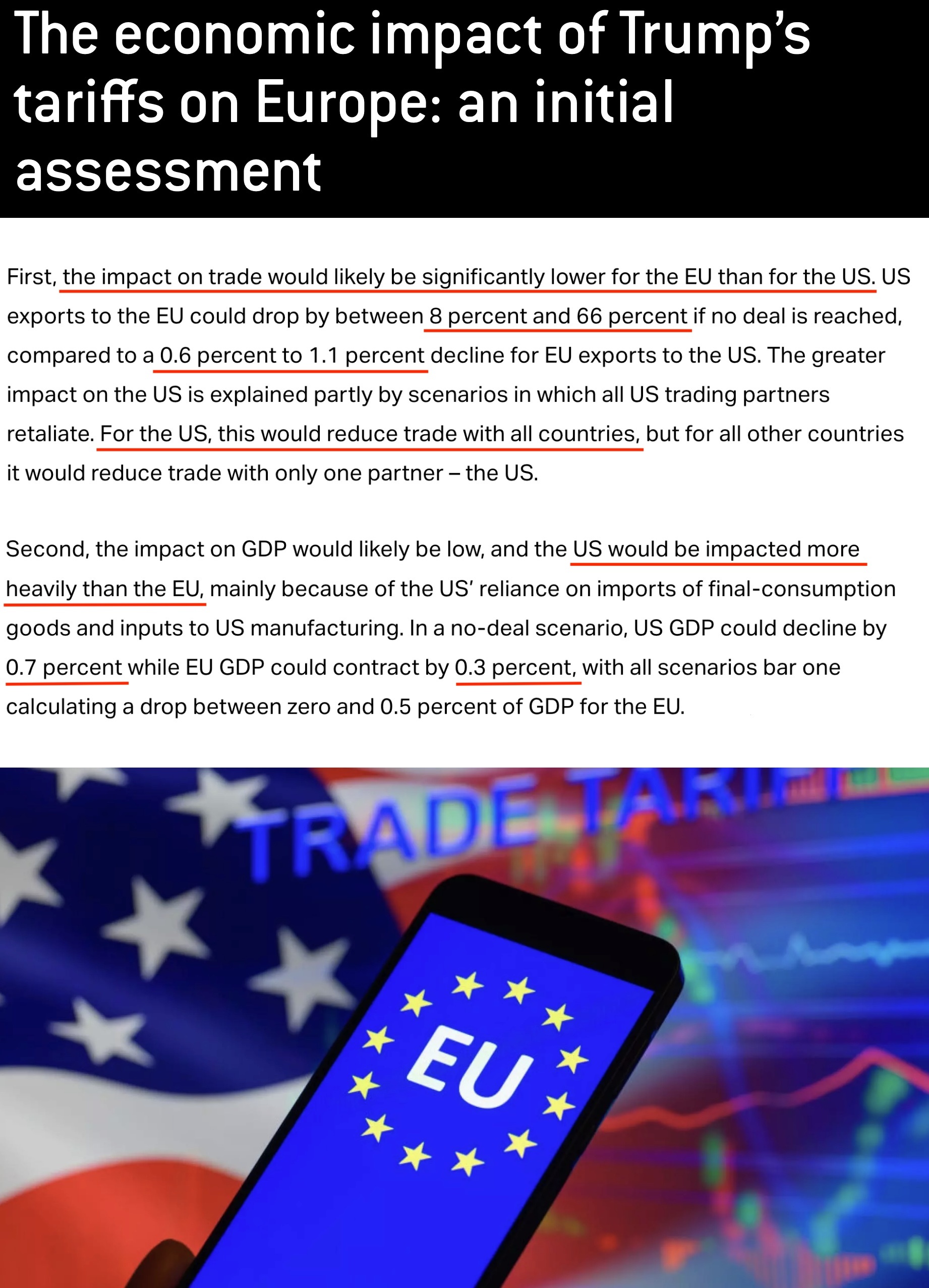 根據比利時布魯蓋爾研究所的最新研究,如果美歐貿易談判失敗,美國對歐出口可能下降8%至66%;而歐盟對美出口只會下降0.6%至1.1%。