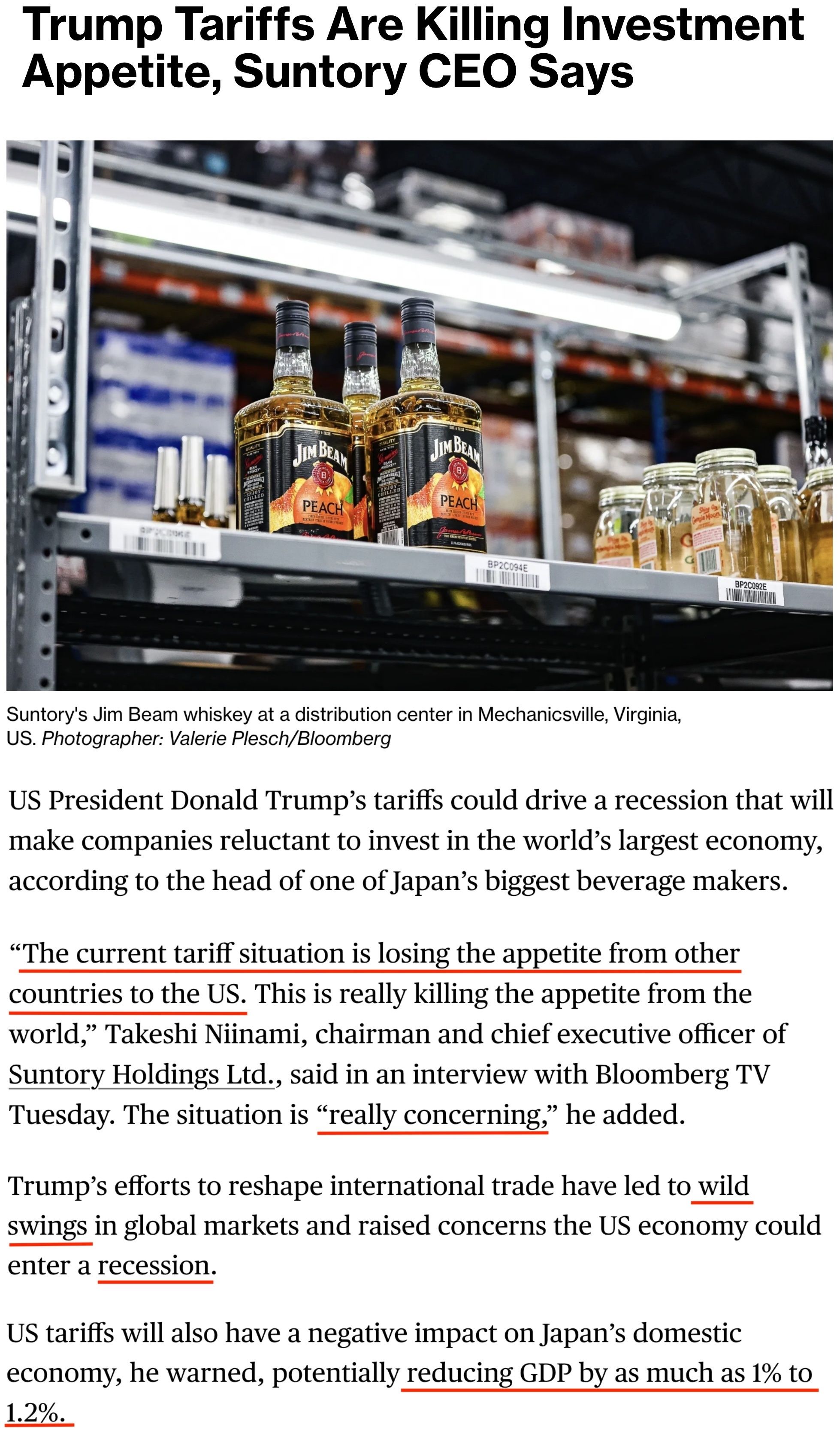 日本首相辦公室高級經濟顧問、日本最大飲料製造商之一三得利公司董事長兼首席執行官新浪剛史22日接受彭博社採訪時警告,美國的關税措施已導致全球市場劇烈波動,可能引發美國經濟衰退,並削弱其他國家對美國的投資意願。