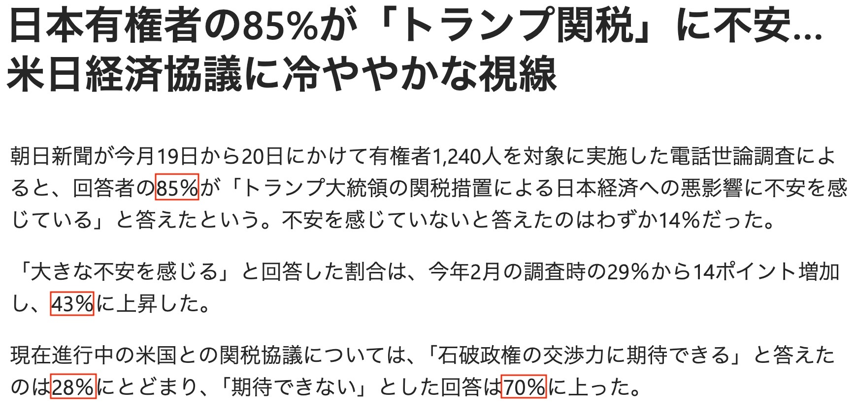 此外,多達70%的受訪者對日本政府與美國政府就關税問題進行的交涉不抱期待。
