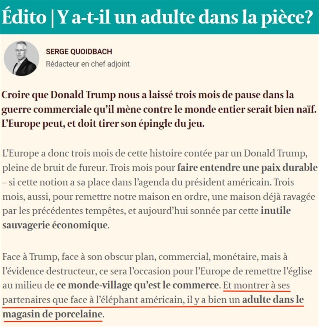 文章強調,歐洲迫切需要推動重建貿易秩序,抓住機遇扭轉局勢,從而向合作伙伴證明,在美國這頭“大象”肆意妄為之際,瓷器店裏仍有“成年人”坐鎮。