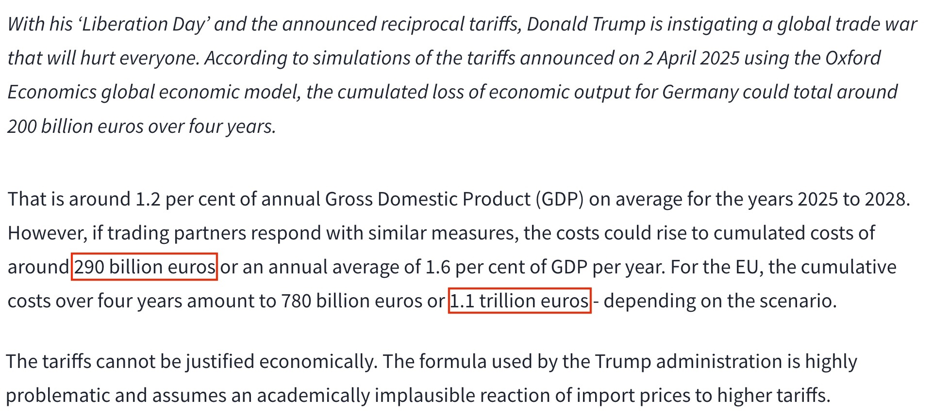 德國經濟研究所日前發佈的研究報告顯示,未來四年內,美國“對等關税”措施可能令歐盟損失1.1萬億歐元,僅德國就將損失2900億歐元。
