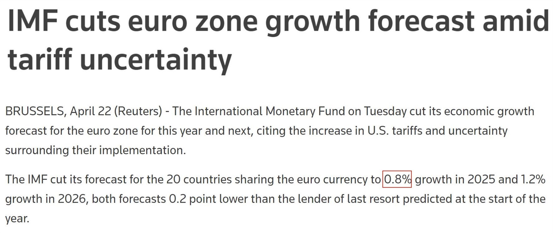 根據國際貨幣基金組織22日發佈的最新一期《世界經濟展望報告》,受美國關税措施衝擊和政策不確定性的影響,今年歐元區經濟增長率預計將比之前下調0.2個百分點至0.8%。