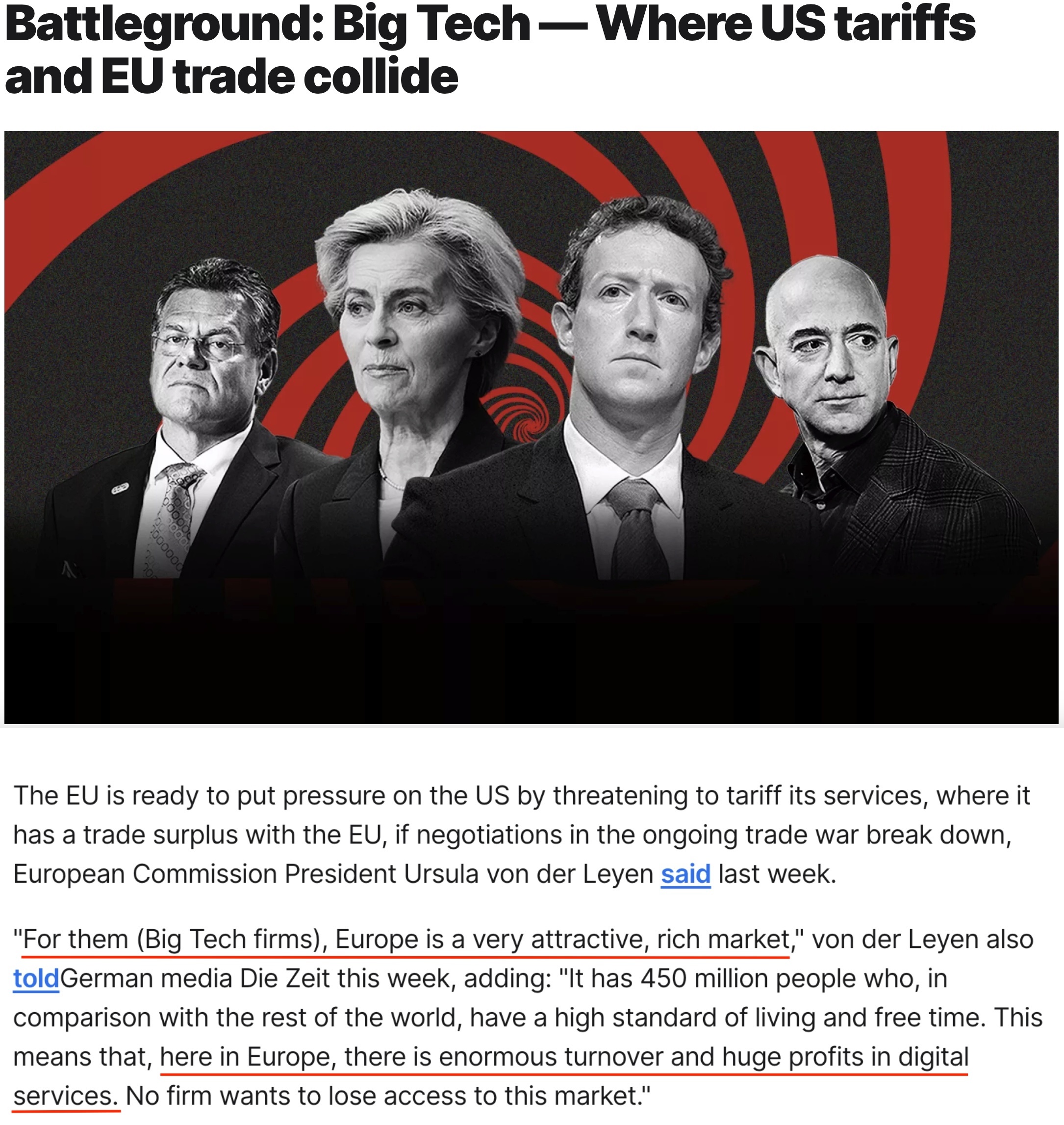 馮德萊恩強調,歐盟有4.5億人口,民眾生活水平高,這意味着在歐盟,數字服務有着巨大的營業額和利潤,沒有誰願意失去進入這個市場的機會。