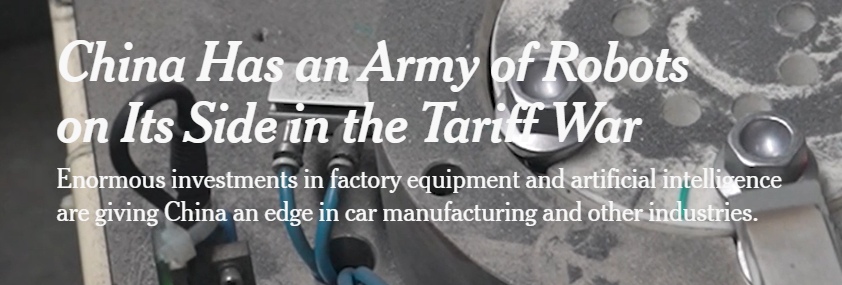 《紐約時報》網站近期的一篇文章聚焦中國製造業領域的機器人大軍,認為它們徹底改變了中國的製造業,使得中國工廠有能力將其出口的許多產品價格保持在較低水平,並在應對特朗普的高關税、應對貿易戰方面具有優勢。