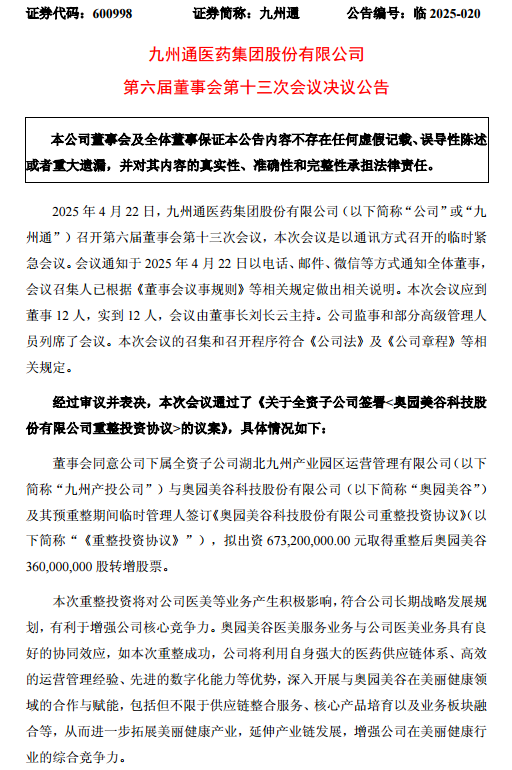 【環球網消費綜合報道】2025年4月24日,醫藥流通企業九州通(600998)披露了一項重大投資計劃,其全資子公司九州產投公司擬出資6.73億元參與奧園美谷(000615)的重整,試圖在後者重整後成為其控股股東。此舉被市場解讀為九州通進一步加碼醫美賽道的戰略舉措。