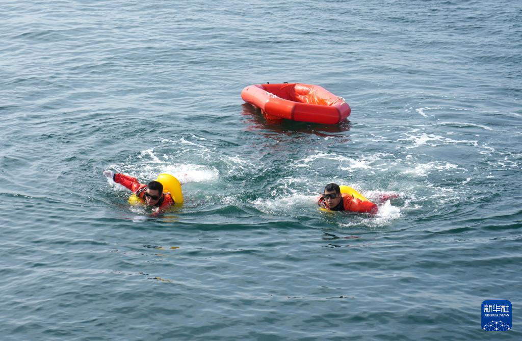 神舟二十號航天員王傑(右)在參加海上救生訓練(2023年7月1日攝)。新華社發(孔方舟 攝)