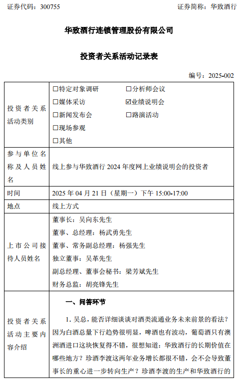 【環球網消費綜合報道】華致酒行近日在2024年度網上業績説明會上表示,儘管白酒行業面臨週期性調整,公司依然看好酒類流通領域賽道,長期價值將聚焦於名酒保真、供應鏈服務以及連鎖門店、高性價比產品開發和培育方面。