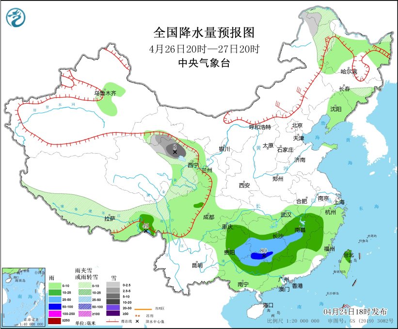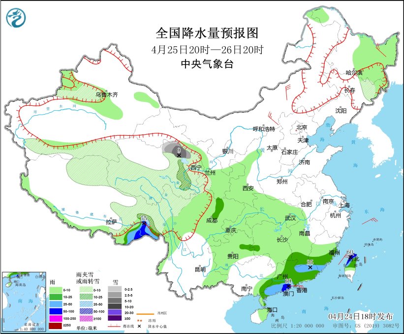 *4月24日20時至25日20時,*內蒙古東北部、黑龍江西北部、新疆沿天山地區和南疆南部、西藏北部和東部、青海南部和東部、川西高原北部等地部分地區有小到中雪或雨夾雪,局地有大雪(5~8毫米)。西藏東南部、廣西南部、廣東大部、江西南部、福建南部和東部、浙江南部、海南島北部、台灣島北部等地部分地區有中到大雨,其中,西藏東南部、廣西西南部、廣東中部、福建東北部等地部分地區有暴雨(50~80毫米)。內蒙古中東部、東北地區西部和南部、山東半島等地有4~6級風、陣風7~8級;台灣海峽、台灣以東洋麪有5~7級、陣風8級的東北風(見圖1)。