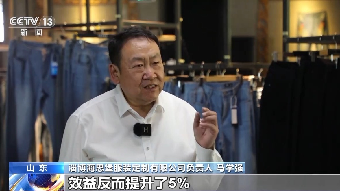 *淄博海思堡服裝定製有限公司負責人 馬學強:*牛仔服裝的價格不降反升,相比原先出口美國市場,效益反而提升了5%。