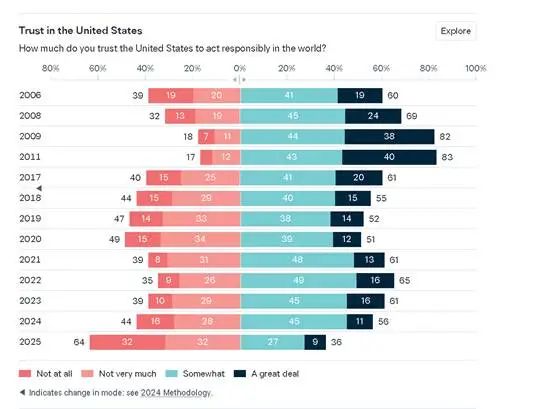 仍然願意相信美國的受訪者比例僅為36%,比2024年時的56%暴跌了20個百分點。