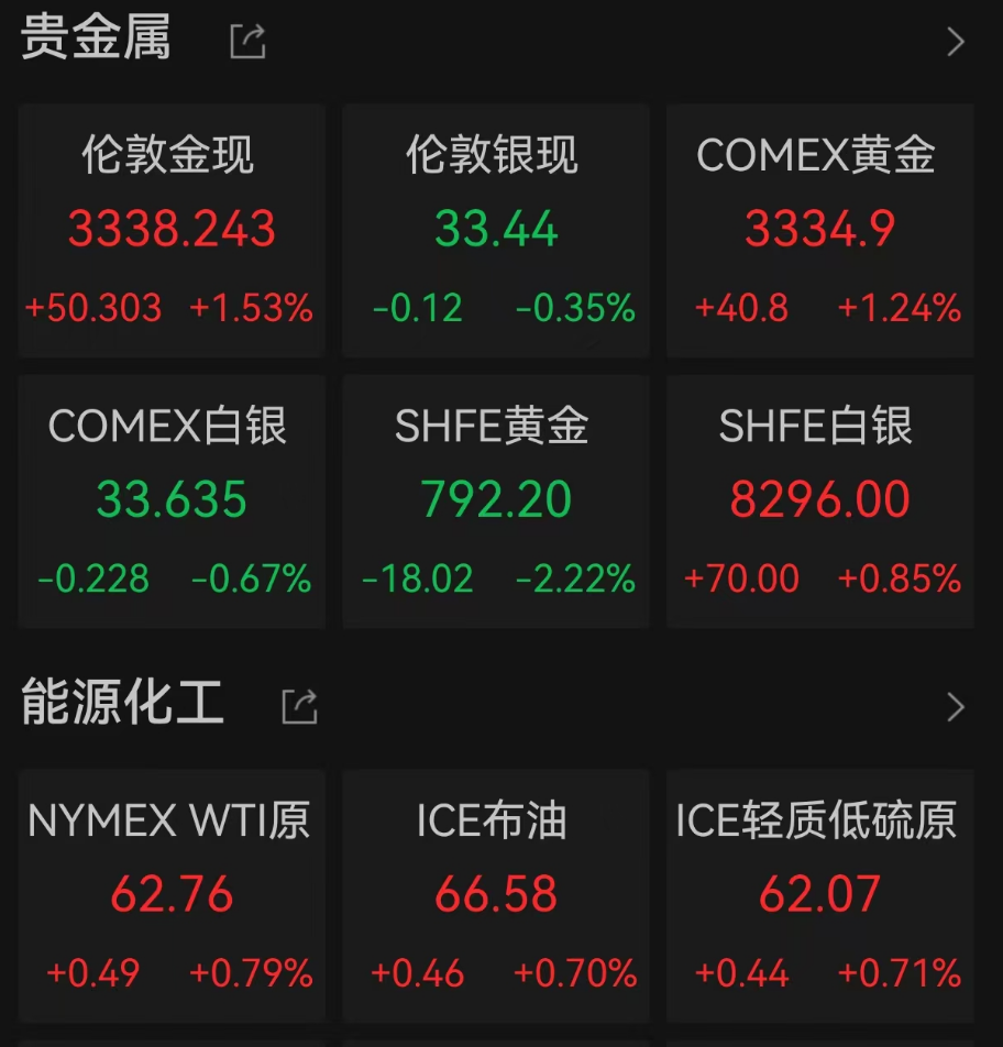 截至22:49,COMEX黃金期貨主力合約上漲1.30%,重新站上3300美元/盎司關口,報3336.8美元/盎司;NYMEX原油期貨及ICE布油期貨主力合約上漲近1%。