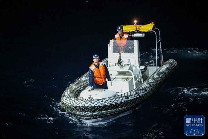 ↑2月16日,在中國黃巖島附近海域,高欄艦海警執法員開展夜間吊放執法艇訓練。