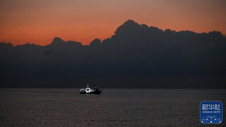 ↑3月25日,在黃巖島附近海域,一名海警執法員在高欄艦上觀賞晚霞。