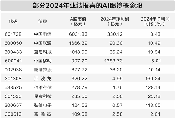 二級市場表現方面,據數據寶統計,截至4月24日收盤,上述15只業績報喜的AI眼鏡概念股中,今年以來僅有5只個股上漲,分別是弘信電子、明月鏡片、宇瞳光學、中國電信、中國聯通。5只個股今年以來累計跌幅超10%,分別是富瀚微、麥捷科技、鵬鼎控股、天鍵股份、星宸科技。