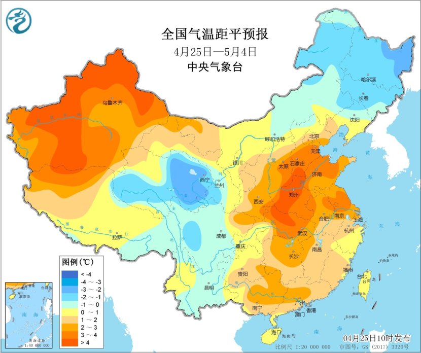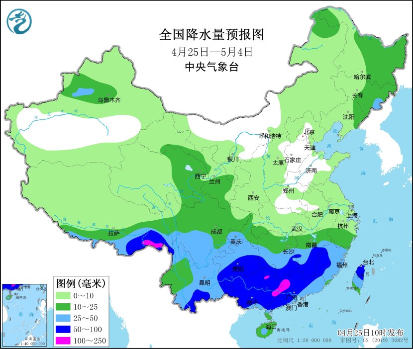 未來10天(4月25日-5月4日),江南南部、華南以及貴州和西藏東南部等地累計降水量有40~70毫米,部分地區有80~120毫米,局地超過150毫米;新疆北部、青海東部、甘肅南部、內蒙古東北部、東北地區北部和東部等地的部分地區累計降水量有10~30毫米;上述大部地區累計降水量較常年同期偏多2~6成,局地偏多1倍以上。