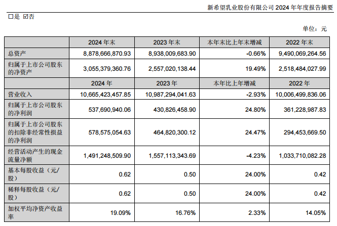 2024年度,新乳業實現營業收入106.65億元,同比下滑0.66%;實現歸母淨利潤5.38億元,同比增長24.80%,連續5年雙位數增長。