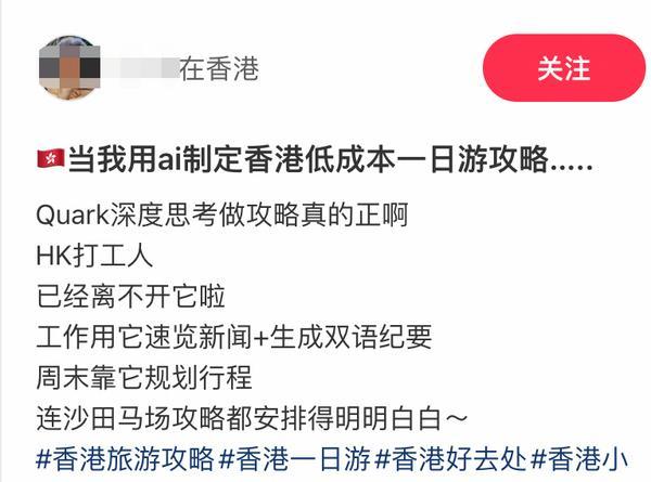 記者發現,眾多來自港、澳、台地區及新加坡的用户在社交平台分享了使用夸克的切身體驗。他們普遍認為,夸克“AI超級框”功能可以很好適配日常生活中的多元場景。例如,夸克AI PPT、學術搜索可以幫助職場人快速生成商務報告、瞭解業界前沿觀點,夸克深度思考協助有出行需要的用户輕鬆規劃旅程,安排個性化線路,家長則可通過拍照搜題解析學科知識點,隨時隨地高效輔導孩子的功課。